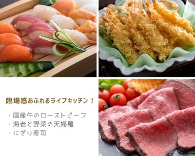 シェフの奏でる料理を目の前で堪能、心躍る「ライブキッチン」で熱々できたてを味わってください。 目の前でシェフが調理、五感で味わう、ライブ感も楽しめます。