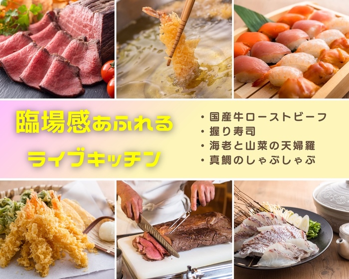 シェフの奏でる料理を目の前で堪能、心躍る「ライブキッチン」で熱々できたてを味わってください。