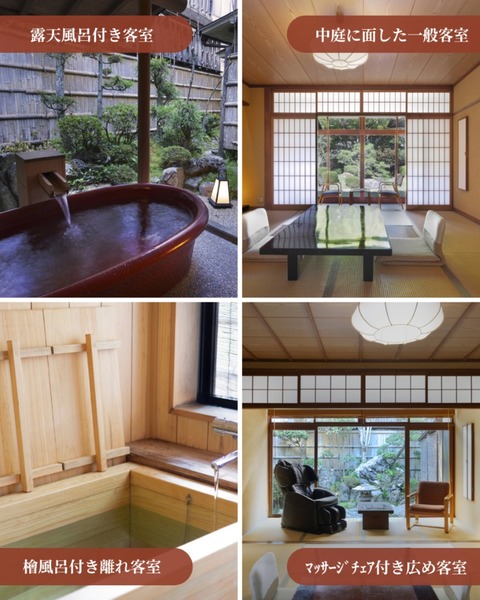 その1:ご宿泊料金全ての予約経路の中で、最も安くご宿泊いただける金額設定であることを保証いたします。 ※各予約サイト運営会社の独自SALE施策や独自配布のクーポン利用等の場合等を除く。 ※プランやお日にちによって、他のサイトと同額最安値の場合あり。 その 2:HP限定部屋タイプ 「檜(ひのき)風呂付き離れ客室」及び「マッサージチェア付きゆったり広め客室」は、 お部屋数が少ないため、HP限定での販売です。 ※当旅館は全館禁煙です。一階の喫煙スペースをご利用ください。