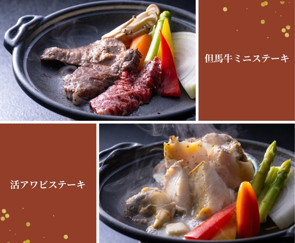 ◆但馬牛ミニステーキ(100g/一人前) 2,750円(税込) ◆活アワビステーキ(約80g/一人前) 2,750円(税込)