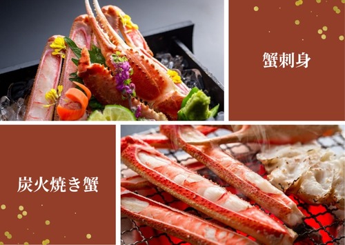 当プランは蟹鍋と茹で蟹のみ。 「蟹刺しや焼き蟹も食べたい」お客様へ..... ― 追加料金 ― ◆蟹刺身(半丁/一人前) 4,950円(税込) ◆炭火焼き蟹(半丁/一人前) 4,950円(税込) ※必ずご予約時にご指定下さいませ。 ※炭火焼き蟹は大勢様(グループ様)のご注文の場合におきましては、炭火がたいへんに危険である為、調理場であらかじめ調理して提供させていただく場合がございます。ご了承下さいませ。