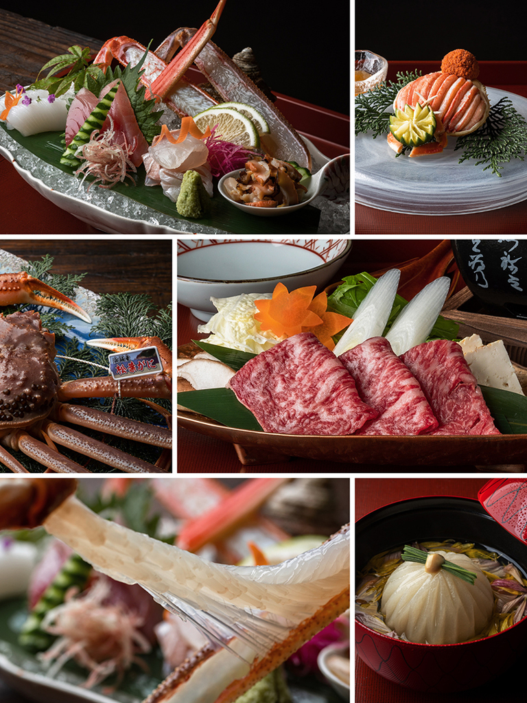 【 お献立 】 先 付 椀 物 御造り(松葉蟹 他4種) 焼き松葉蟹・甲羅味噌焼き 箸休め 但馬牛 牛すき小鍋 御食事 水菓子 ----------------------------------------- ※勢子蟹の甲羅盛りは、12月末までの期間限定のお料理です。 ※地元港産(津居山港、柴山港、香住港など)の活がにをお一人様につき一杯、使用します。
