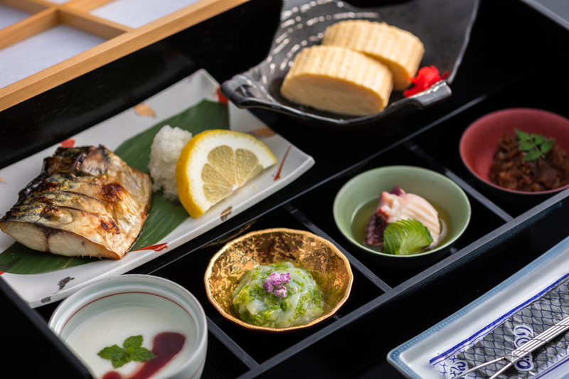 Breakfast includes grilled fish, Tajima-style chicken hot pot, Japanese omelet, and more.